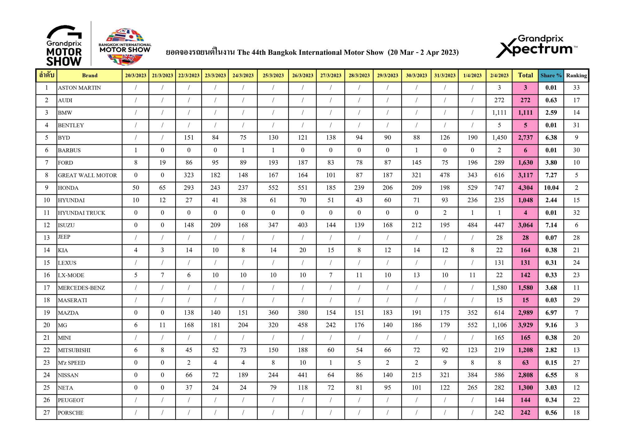 “The 44th Bangkok International Motor Show” was successful as expected with more than 1,620,459 visitors to the event. Also, more than 40 brands of automobiles and motorcycles participating in the event were pleased to collect a total number of reservations at 45,983 units in all segments, resulting in the overall picture of the Thai automotive industry this year maintaining the rate of continuously growing.