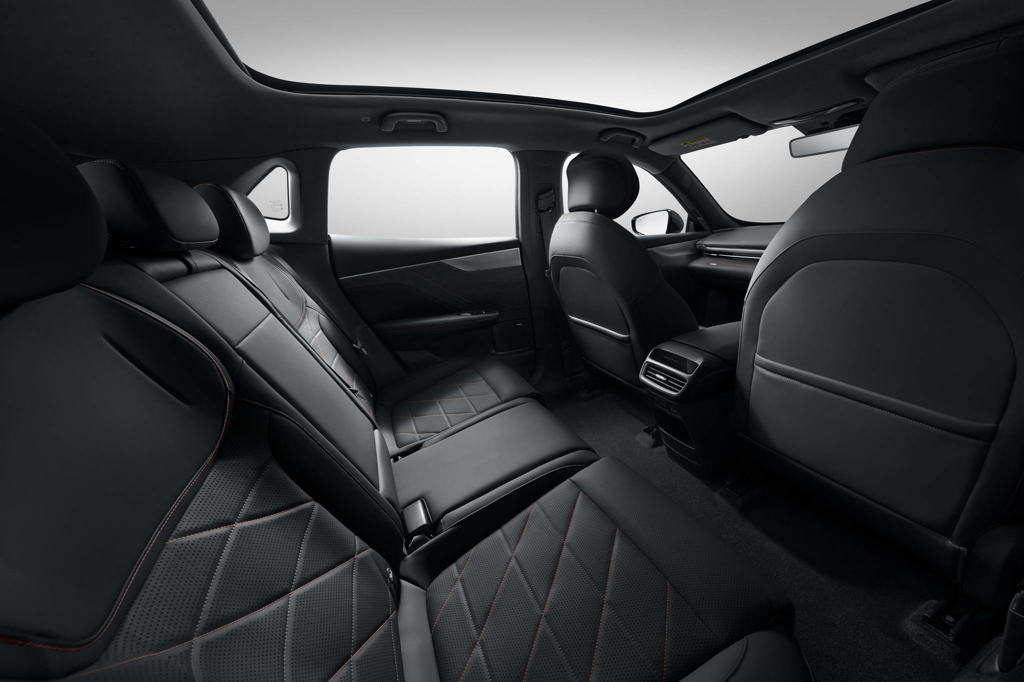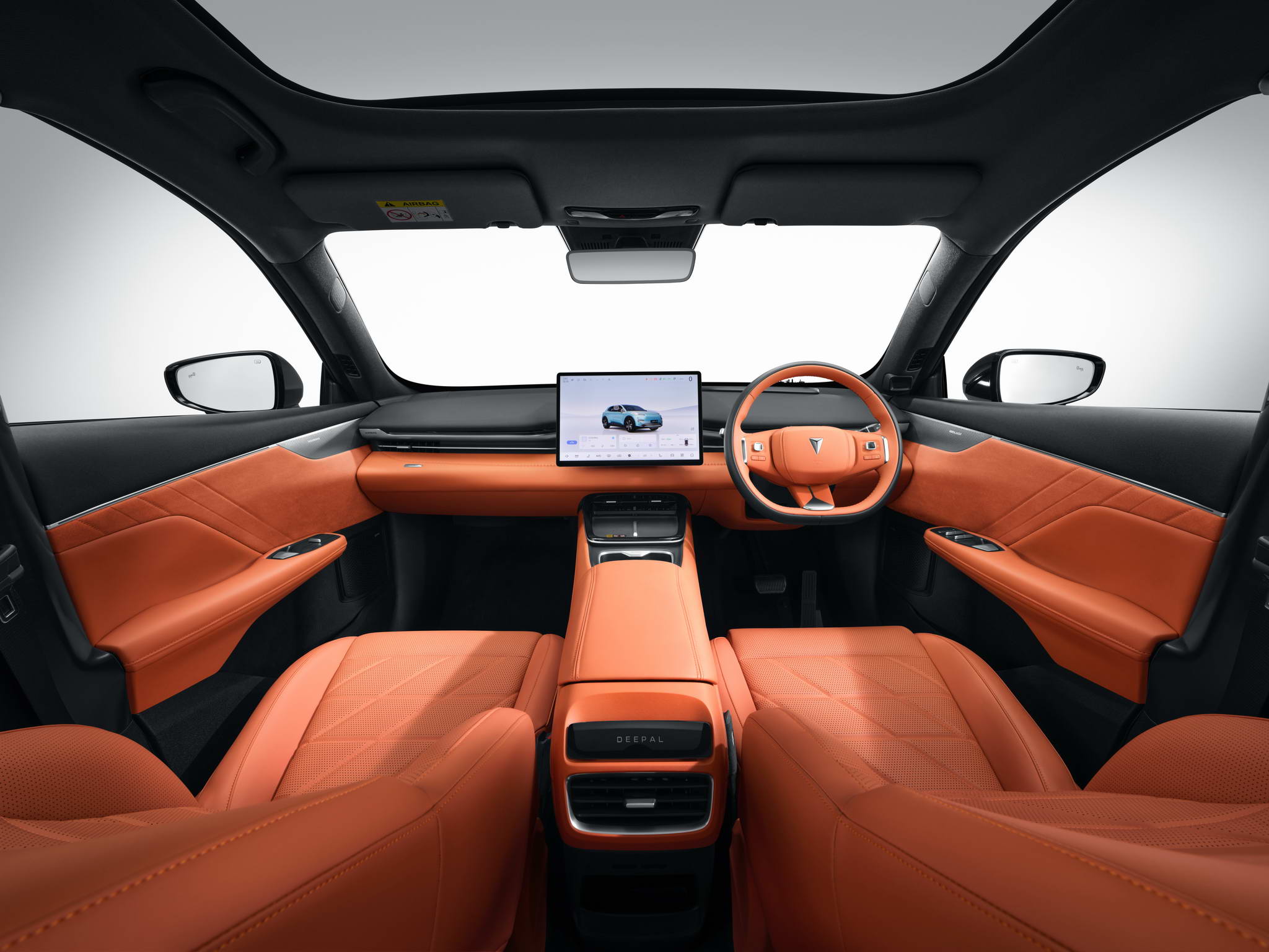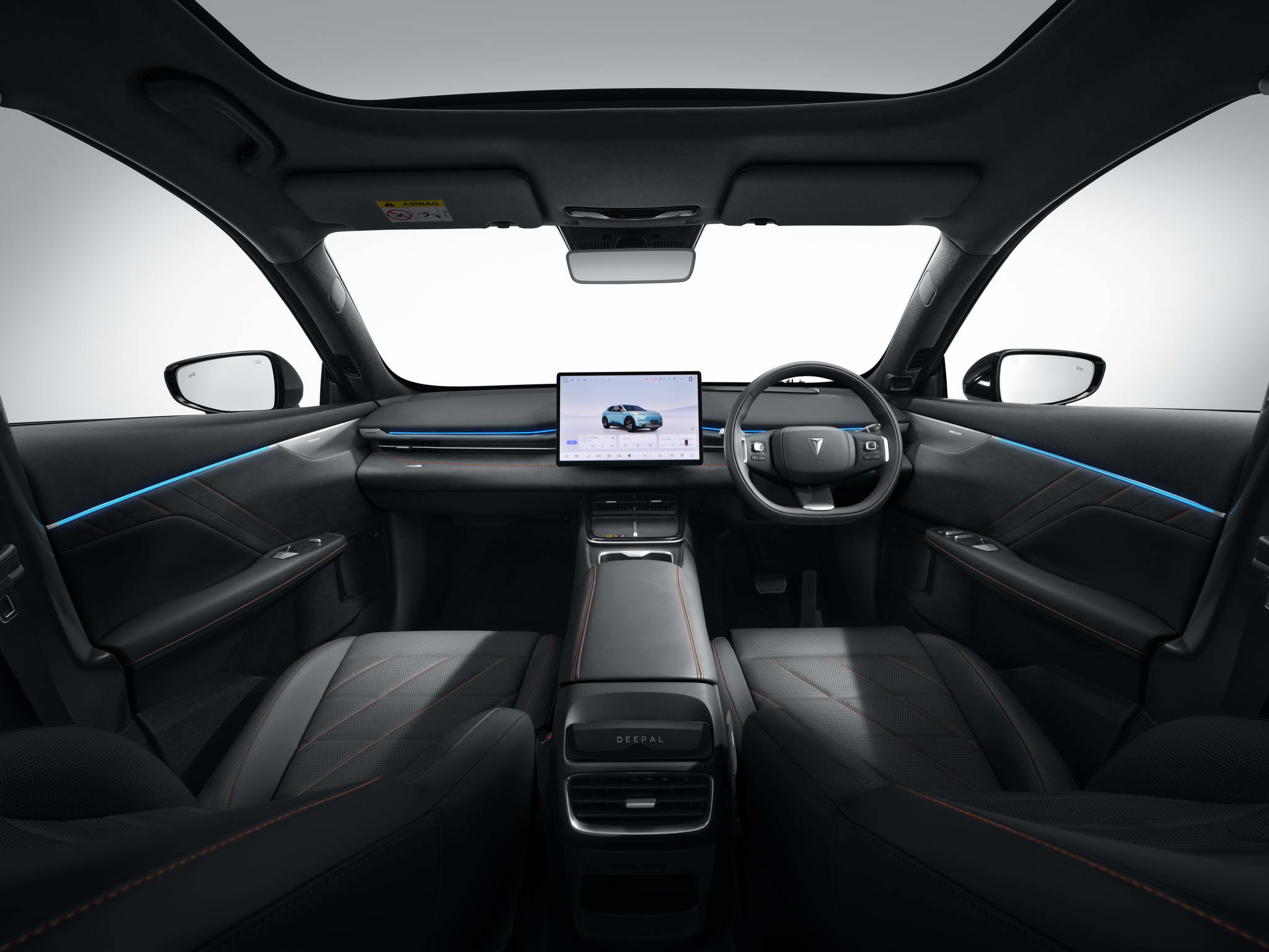 - Sporty and Stylish: The 18-inch two-tone alloy wheels (upgradeable to 20-inch with additional cost) enhance the DEEPAL S05’s sporty stance. The panoramic 1.9m2 glass roof provides an airy and spacious feel within the cabin while adding to the vehicle’s exterior appeal. The long wheelbase and double waistline side profile emphasize the vehicle’s size, while the slim design LED full-to-width taillight creates a bolder rear appearance.